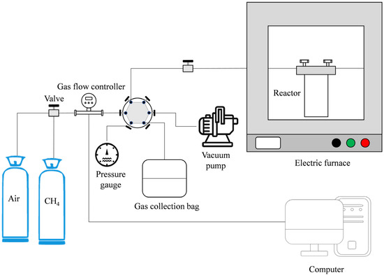 The experimental setup composed of a reactor, electric furnace, vacuum pump, six-way valve, gas bottle, gas flow controller is shown in Figure 2. The reactor was at the max temperature of 600 °C, and a max pressure of 400 bar was used for the static experiments. The volume of the reactor is 0.16 L. The electric furnace with a max temperature of 1200 °C was purchased from Tianjin Zhonghuan Electric Furnace Co., Ltd. (Tianjin, China). The gas flow controller controlling gas flow from 0 mL/min to 270 mL/min in standard state was bought from Netherlands, Bronkhorst.
