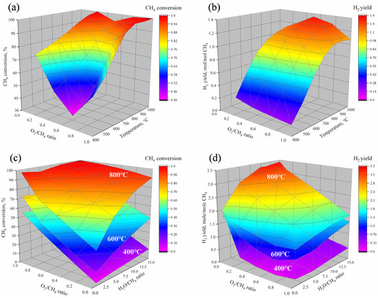 The results of thermodynamic calculation according to principle of minimum Gibbs energy. (a) © methane conversion of POM at different O/C and temperature, (b) the hydrogen yield of POM at different O/C and temperature, (c) the methane conversion of ATR at different S/C, O/C and temperature, and (d) the hydrogen yield of ATR at different S/C, O/C and temperature.