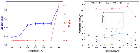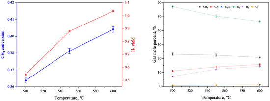 The results of methane conversion and hydrogen yield (left) and the mole fraction of gas components (right) at different temperatures in POM.