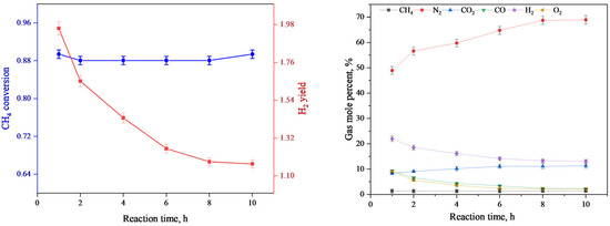 The results of methane conversion and hydrogen yield (left) and the mole fraction of gas components (right) at different reaction times in POM.