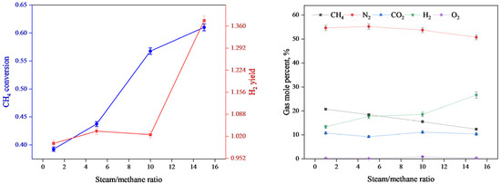The results of methane conversion and hydrogen yield (left) and the mole fraction of gas components (right) at different steam/methane ratios.