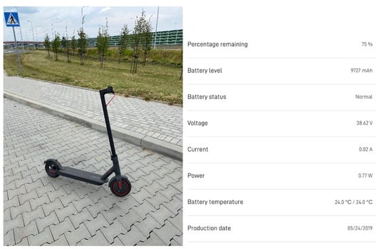 The subject used to conduct research is an electric scooter used in shared mobility systems, which is available in many urban agglomerations. The scooter was equipped with an electric motor with a power of 300 W and a battery capacity of 475 Wh. Figure 1 show an electric scooter and examples of values recorded during the tests.