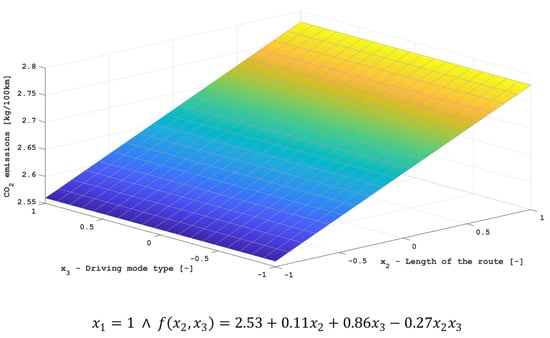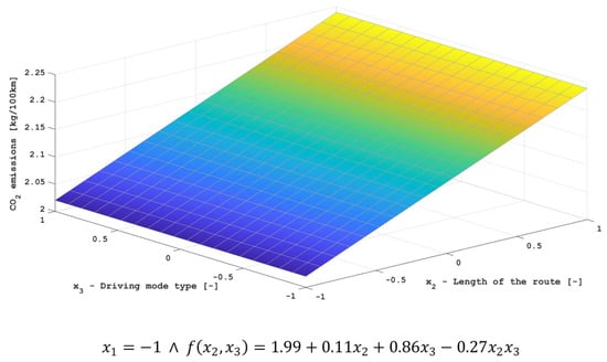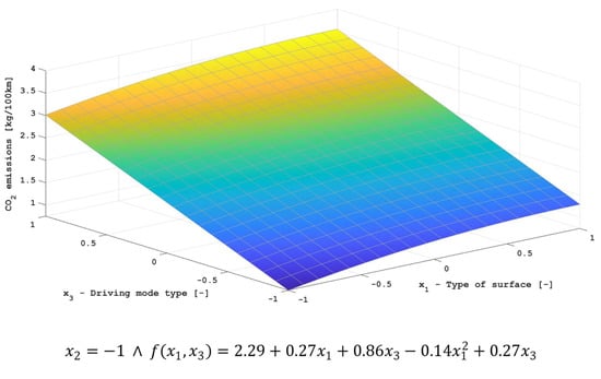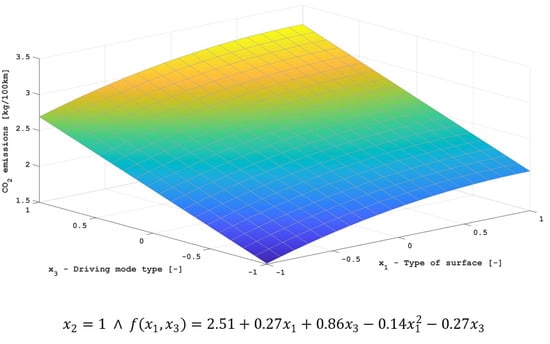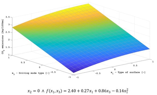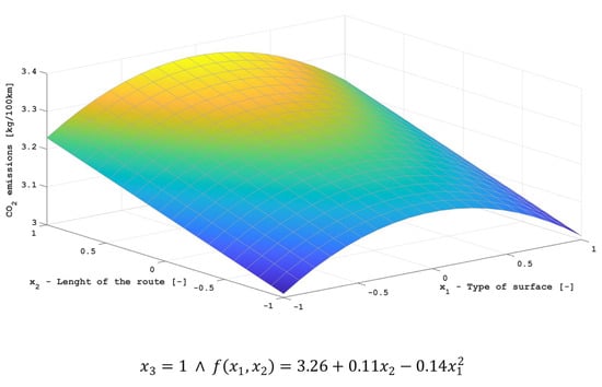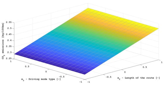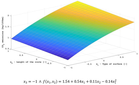 Thanks to the obtained results presented in Table 3 and the use of Formula (4), it was possible to determine the dependence of the impact of the selected factors x1, x2, and x3 on the CO2 emission value expressed in kg/100 km unit. Figure 3, Figure 4, Figure 5, Figure 6, Figure 7, Figure 8, Figure 9, Figure 10 and Figure 11 predict the dependence of the type of surface, distance travelled, and driving style on CO2 emissions, although some of the values shown in the diagrams are the result of prediction according to Formula (4). The biggest CO2 emissions will be emitted by moving an electric scooter on a paving stone over a distance of 1 km. The lowest emissions were recorded for a scooter that moves on an asphalt road while covering a 5 km route. It is worth noting that the lowest consumption is almost three times lower than the value of the maximum CO2 emissions that have been achieved.