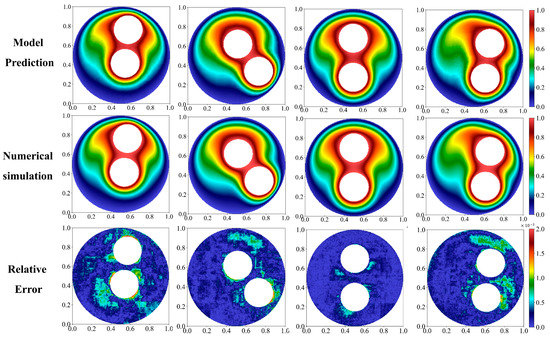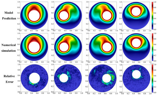 The temperature field predictions of the nanofluid-filled annulus on test data are shown in Figure 3 with four representative cases. Three rows illustrate, respectively, the predicted results, the numerical simulation (true results), and the error analysis. To test the geometry adaptive ability of the model, as mentioned before, the test dataset is independent of training and validation datasets. As seen from the predicted and the simulated results, heat is transferred from the inner cylinder to the periphery, and accordingly, the temperature decreases in the same direction. Furthermore, heat is transferred faster towards the upper center of the annulus. Therefore, for the cases in the first and the fourth columns, the left-right symmetrical annulus leads to a left-right symmetric temperature prediction. As seen from the error distribution of the third row, the absolute error values are very small, where the most points are less than 0.02% and all the points are less than 0.1%, which means the accuracy is higher than 99.9%. Most of the larger error points appear around the inner cylinder, where there is a big temperature gradient. It is more difficult to learn the heat transfer mechanism of the left–right asymmetrical nanofluid-filled annulus for the proposed geometry adaptive predictor.