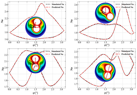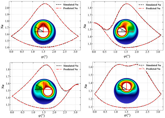 First, we look at the local Nusselt number distribution along the angular direction of the outer wall, as shown in Figure 5, where the same four inner-cylinder test data as in Section 3.1 are used. The black dashed curve represents the simulated Nu, calculated according to Equation (10) using the temperature results of our numerical simulation in OpenFOAM. The red dash line represents the predicted Nu, mapped directly from the cross-section geometry of the annulus. We also show the corresponding temperature field in subfigure to clearly show the relationship between the temperature distribution and the Nu distribution. As seen from the comparison between the four sets of curves, the simulated and the predicted Nu are very close. The predictor ‘learns’ the Nu distribution of the outer wall along the angular direction, where all the curves form a closed loop without self-intersect where the largest Nu always occurs in the top area of the cylinder. Looking at the definition of the local Nusselt number given in Equation (10), we can see that its value is proportional to the temperature gradient normal to the boundary. Therefore, the results indicate that on the surface of the outer wall, the highest temperature gradient always occurs in the top area of the annulus.