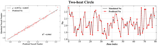 The left subfigure of Figure 8 shows the coefficient of determination R2 between the simulated and the predicted average Nu numbers obtained from the clouds of points. Although the accuracy is lower than the single-inner-cylinder predictions, the R2 value is still higher than 0.99, and most of the points fall on the black line, which is very close to y = x. The right subfigure of Figure 8 compares the average Nu values of the outer wall for 80 samples; the results are consistent with the previous ones, where the predicted Nu agree well with the simulated ones.