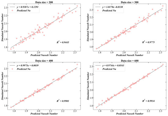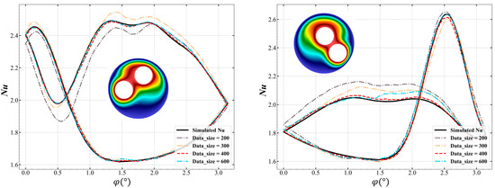 As shown in Figure 9, the coefficient of determination R2 increases with the augmentation of the data size, the highest value is 0.9934 with the data size of 600. However, the R2 values of the other three data sizes are not far behind, especially the R2 of 400 data, which is 0.9901—very close to the value of for the 600 data. Figure 10 provides the Nusselt number curves of two representative double-inner-cylinder annuli with various data size, where we can clearly see the discrepancy of the curves. The curves of the 200 and the 300 data show relatively large errors, and the curve of the 400 data seems to agree best with the simulated results. Therefore, considering both the time required for data generation and the model training, as well as the above model analysis, the data size of 400 is chosen in our study.