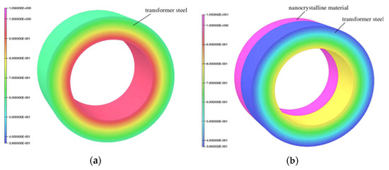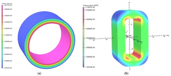 The distribution of the magnetic induction [T] in (a) the measurement current transformer 600 A/5 A with a toroidal core (b) the core of the protection current transformer of the 200 A/5 A in the steady state for the rated conditions.