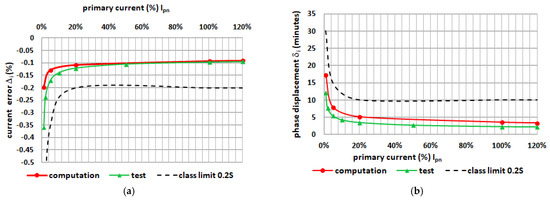 Comparison of the (a) characteristics of the current error and (b) phase displacement from the calculations and tests for 600 A/5 A current transformers with a toroidal core at a power load of Sn = 2.5 VA. cosφ = 0.8 (Ipn = 600 A).