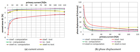 The solution field-circuit method with Helmholtz-type Equations (10)–(12) allows for determining the complex values of the secondary current. Then, based on Formulas (1) and (2), the characteristics of the current error and phase displacement are determined at the currents set by the standard [5] (Table 1 and Table 2) from 5 to 120% of the rated value and with an impedance load (in the range from 0.25 to 1 of its rated value) [17,25,27,28,29,30,31].