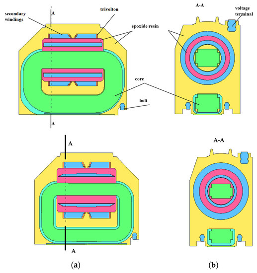 Two constructional variants of the same external dimensions of the voltage transformer 15:kV/100: V (a) before redesign and (b) after redesign.