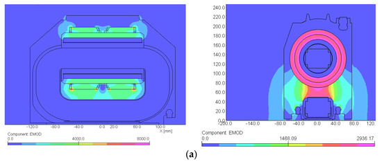 As a result of the calculations, it turned out that the highest stresses occur in the areas of the corners of the primary coil in the insulation, which are made of trivolton H foils separated from each other by epoxy resin layers. When supplied with a 1 min 38 kV test voltage (Figure 19), they reach the value of 16.2 kV/mm in version 1 and 12.3 kV/mm in version 2 after the redesign. The redesign mainly involved a change in the core cross-section.