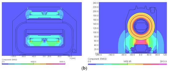 Distribution of the electric field strength (V/mm) in the area of the voltage transformer 15:kV/100: V after redesign, under operating conditions (38 kV—1 min) (a) before redesign and (b) after redesign.