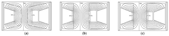Distribution of electric potential (ΔV = 5% Vmax) in the core window of the voltage transformer inductive with oil-paper insulation: (a) version 1, (b) version 2, (c) version 3.