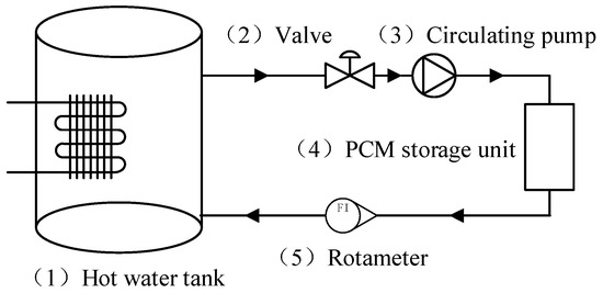 Figure 1 shows a system schematic diagram of the experimental setup. The components in the experimental setup included a hot water tank, a cut-off valve, a circulating pump, a PCM unit, a flow meter and several sections of pipelines. Circulated water was selected as the HTF to evaluate its influence on the melting performance of the PCM.