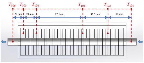 Figure 3 shows the specific locations of the thermocouples arranged in the PCM unit. Six thermocouples were utilized to monitor the temperature field in the unit, including the PCM temperature between the fins (T103), fin temperatures (T102 and T104), PCM temperature without fins (T105), inlet HTF temperature (T101) and outlet HTF temperature (T106). All thermocouples were calibrated in advance by means of comparison between standard and calibrated thermocouples using a temperature calibration furnace, and the measuring range and accuracy of these thermocouples were −20~100 °C and ±0.2 °C, respectively. The temperature calibration furnace used in this study was a high-precision, multi-functional temperature-measuring testing product, and its machine type and temperature range were SPMK313A and −33~155 °C, respectively. The calibration method could be listed as follows: (1) The tested thermocouples were evenly surrounded around the standard thermocouple and tied up together when their measuring ends were on the same vertical plane. (2) The thermocouples were placed in the temperature calibration furnace, a specific temperature value was set and the thermoelectric potentials of the tested and standard thermocouples were measured, respectively. (3) The deviations between the tested thermocouples and the indexing table at the specific temperature points were calculated using the thermoelectric potentials on the indexing table, the potential values of the specific temperature points in standard certification and the differential thermoelectric potentials at each scale point of the thermocouples. In addition, a data acquisition module was used to collect and record the measuring temperatures once every 3 s during the charging process.