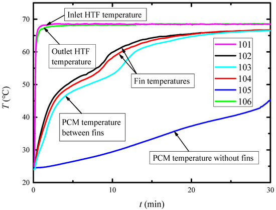 Relying on the experimental setup and procedure described above, trials of case studies were carried out to analyze the melting performance of the PCM unit. Figure 5 shows the transient temperature variation in each measuring point in the PCM unit during the initial charging period of 30 min. The initial PCM temperature was maintained at 25 °C, while the inlet HTF temperature and flow rate were kept constant at 68 °C and 7 L/min, respectively. During the initial charging period, the temperature difference between the inlet and outlet HTF was observed due to the inlet HTF temperature being much higher than the PCM temperature, resulting in the heat transfer from the HTF to the PCM. The PCM temperature between the fins (T103) rose dramatically in the initial period, which was caused by the large temperature difference between the HTF and the PCM. As T103 approached its melting temperature, its temperature rising rate gradually slowed down for a while. This was because the solid–liquid phase change of the paraffin wax absorbed the thermal energy of the HTF by using its latent heat. After the solid–liquid phase change of the paraffin wax was finished, T103 continued to rise slowly as the temperature difference between the HTF and the PCM shrunk. It was observed that both T102 and T104 were higher than T103 for the whole charging process, which meant the temperature gradient between the rectangular fins and the PCM existed. Comparing T105 and T103, the time for the PCM between fins to melt was much shorter than for that without fins. The reason was that the fins employed expanded the heat transfer area significantly between the HTF and the PCM, which enhanced the charging rate greatly. Moreover, the PCM temperature was always lower than the HTF temperature during the entire charging process, which can be illustrated as follows. Firstly, the heat transfer rate between the HTF and the PCM decreased with the reduction in natural convection in the PCM unit when all the PCM was melted completely. Secondly, the thermal loss from the shell of the PCM unit to the ambient environment without insulation prevented the PCM temperature from increasing inevitably.