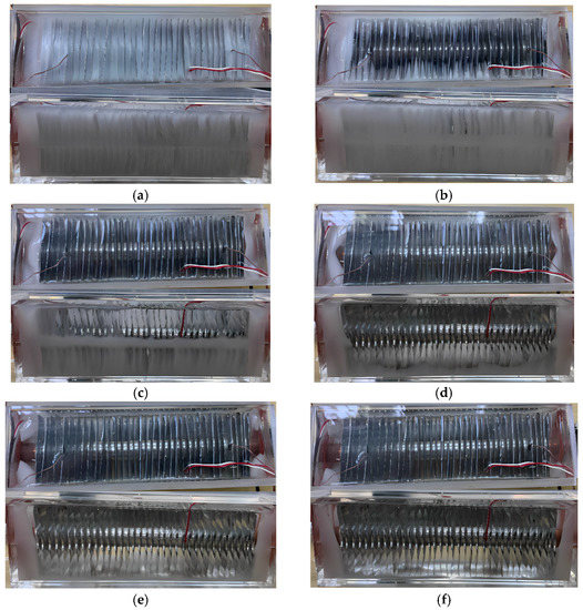 Melting procedure of paraffin wax during different stages of the charging process when THTF = 68 °C and qHTF = 7 L/min. (a) 5 min; (b) 10 min; (c) 15 min; (d) 20 min; (e) 25 min; (f) 30 min.