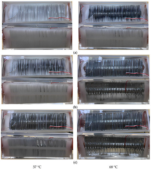 Melting performance of paraffin wax during different stages of the charging procedure with inlet HTF temperatures of 57 and 68 °C. (a) 10 min; (b) 20 min; (c) 30 min.