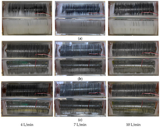 Melting performance of paraffin wax during different stages of the charging procedure with HTF flow rates of 4, 7 and 10 L/min. (a) 10 min; (b) 20 min; (c) 30 min.
