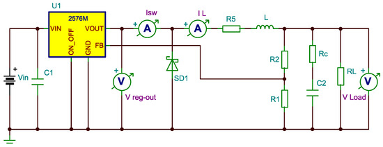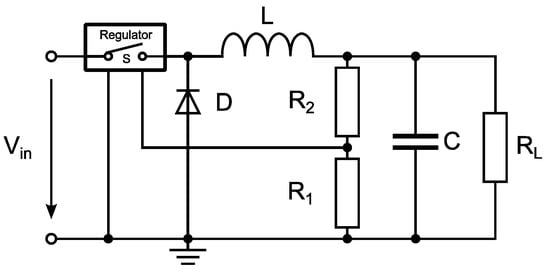 The use of power semiconductor converters in common practice has currently become a matter of course. One of the many areas where they are applied is the conversion of DC supply voltage to DC voltage with other parameters. Different types of DC–DC converter connections are used for this purpose, for instance, to achieve lower output voltage with lower current and voltage ripple [1,2,3], and in other cases, where different control strategies are used [4,5,6], and special topologies [7,8] to achieve better results. The most used connection is probably the buck converter connection [9]. Various manufacturers of semiconductor components have focused on the development and production of different types of switching voltage regulators [10,11,12,13,14,15]. The basic topology of such a buck converter supplemented with several external components is shown in Figure 1. This basic topology contains mandatory electrical components [16] to operate the regulator properly.