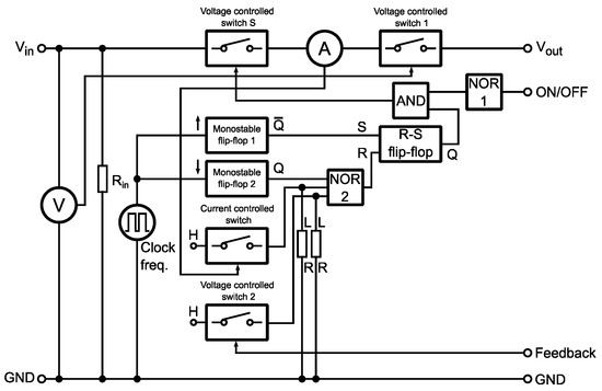 The operation of the proposed controller is as follows. The basis is a frequency generator (clock freq.). It generates a rectangular signal with the required switching frequency of the controller and a duty factor equal to Dmax. The amplitude of the output signal is 5 V due to its further processing using TTL circuits. At the rising edge of its output signal, the monostable flip-flop circuit 1 generates, at its output , a short pulse with a logic level of L, and the pulse feeds the input S of the R-S flip-flop circuit. This sets its output to a logic H value. If a logic L is present at the ON/OFF input, the logic H is transmitted via the AND gate to the voltage-controlled switch S, which turns on. The closed-state resistance of the switch must be set according to the following relation: