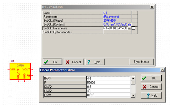 Graphic symbol and property windows of the LM2576 switched voltage regulator model in the TINA program.