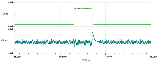 The first obvious difference comparing simulations and real measurements is the voltage drop of the real DC–DC converter on the higher load. This voltage drop is caused by the parasitic resistance of the circuit elements, including joints and the electrical conductor. The measured value of the load resistance was RL = 1.79Ω. This value already included parasite resistance, as mentioned above. This value is thus valid only for the specific load current. The voltage difference between the measured and simulated voltage at the low current is approximately 0.1 V (2%). The goal of the dynamic load state observation is to investigate the time response of the system and voltage ripple change. Moreover, the main goal of the research was to compare the universal model with the existing official models. For this reason, the voltage drop on the parasite resistance differences was not taken into account in the simulations. Another difference is the slightly lower VLoad value of the universal model compared to the official models and the real measurement. This behavior was already explored above in Figure 21. In order to investigate the problem, Equation (4) was used to calculate the expected output, and the values of the real resistance were applied. The calculation result is in (5):