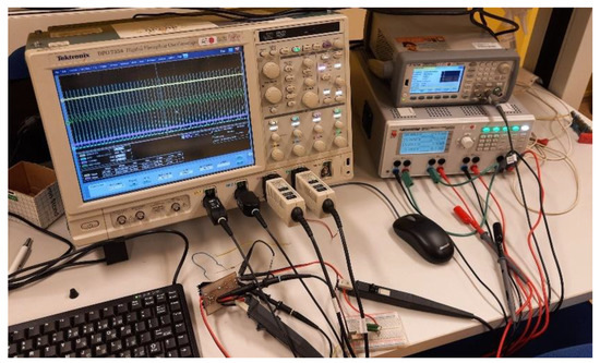 First, the steady-state circuit parameters were compared. The parameters mentioned in Figure 5 and Figure 6 were measured and compared with the simulations. An example of a steady-state measurement is shown in Figure 13.