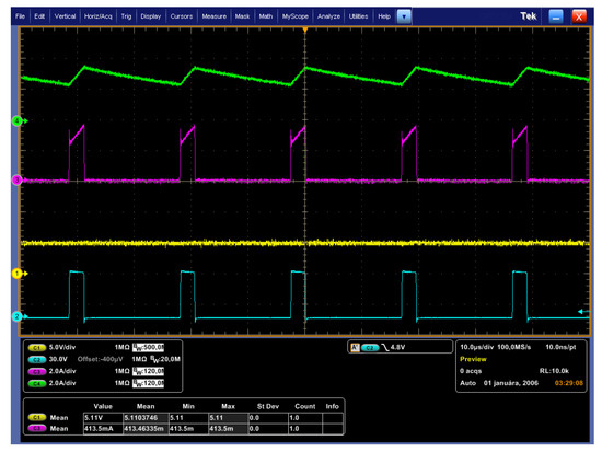 The two wire loops that can be seen on the bottom of the PCB are used for current measurement, where current from the switch (Isw) and current through the coil (IL) (according to Figure 5) are measured. Moreover, other circuits component values from the Figure 4 circuit were updated according to the real component as follows: L = 108 μH, R5 = 103 mΩ, Vin = 45 V, R1 = 3.1 kΩ, R2 = 9.5 kΩ, C1 = 100 μF, C2 = 883 μF, and Rc = 61 mΩ. The SD1 diode was implemented by an MBR1645. The real component’s value was measured on a HAMEG HM8118 LCR bridge. The load resistance, including parasite resistance, was calculated from the load voltage and load current measured using an oscilloscope and the resulting resistance value was RL = 1.79 Ω.