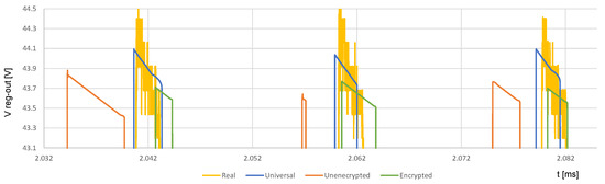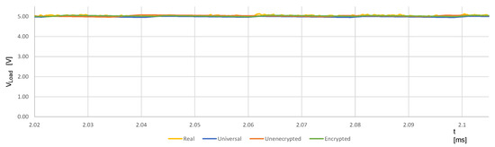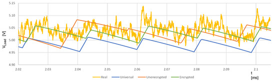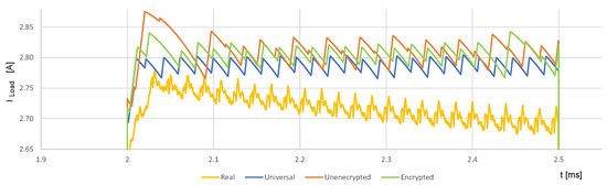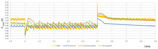 The most important parameters to observe are the frequency of the waveforms, voltage ripple (peak-to-peak), waveform shape, and value average. The phase shift between the signals is irrelevant from this point of view. The real measurement waveform is noisy, but it is possible to see the ripple and frequency of the signal when focusing on higher peaks. The average value of the load voltage between the waveforms difference is approximately 0.06 V only, where the universal model has the lowest average, 4.98 V, and the real measured values have the highest average at 5.04 V. The encrypted model average was 5.02 V, and the unencrypted model was 5.028 V. As can be seen from the detailed view, the ripple of other models is optically almost identical, especially when comparing the encrypted and the universal model. As mentioned above, the average load voltage value calculated from the universal model is the lowest, but the real differences are negligible.