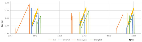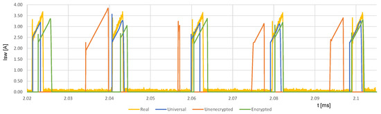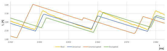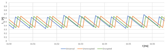 A comparison of the current course flowing through the coil IL is shown in Figure 18. The graph curves of universal, encrypted, and measured data are very close to each other with minimal differences.