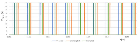 Figure 14 shows that all the time graph curves are similar. More significant differences can be seen from an unencrypted model where a certain level of instability can be observed. Generally, the signal from the universal model and encrypted model are very close in shape, amplitude, and frequency to each other and to the measured signal. A more detailed look at the amplitude differences is shown in Figure 15.