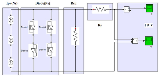 The photovoltaic I–V curve is specified with Equation (1), in which series resistance (Rs), parallel resistance (Rsh), the number of cells connected in the series (Ns), q electric charge, k Boltzmann’s constant, and the parallel of the equivalent panel (NP) are included [28].