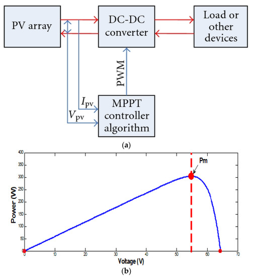 Photovoltaic systems have low efficiency that should be investigated [8,9]. One of the most economical ways to improve the efficiency photovoltaic systems is to guarantee performance at the maximum power point (MPP) regardless of weather conditions [10,11]. Obtaining the MPP from photovoltaic systems has a significant role in increasing efficiency. This can be achieved by connecting the MPP tracker controller (typically a chopper) [12] to adjust the duty cycle to match the load. The electrical power provided by solar systems depends on the temperature insulation and the amount of radiation. Solar cells have an optimal operating point that is found by a tracking controller. When making a direct connection between the load and the source, the output of the photovoltaic module is rarely at maximum power and the operating point is not optimal. To solve this problem, an MPPT controller with a DC/DC converter between the load and the source is used to compensate the output voltage of the solar panel and keep the voltage constant at a value that maximizes the output power.