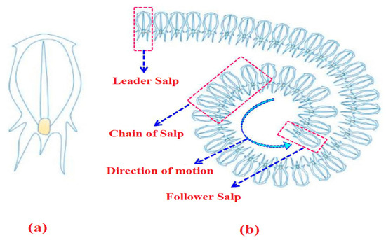 The SSA algorithm belongs to the family, which has a transparent and tubular body [30,31]. Their body texture is identical to jellyfish, and they move similarly to them. In this way, water is pumped through the body to provide forward thrust. Figure 3 delineates the shape.