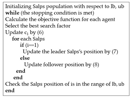 where , and indicates the ith follower position in the jth dimension. We simulate chains by Equations (5) and (8). Figure 4 gives the SSA algorithm pseudocode.