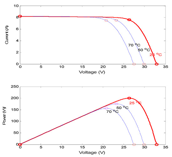 In this study, KC200GT photovoltaic module data and specifications of the panel used in this study are presented in Table 1, and the selected boost converter information is presented in Table 2. In Figure 6, the I–V and P–V characteristics of the photovoltaic module considered in this study are shown at different temperatures. Both characteristics indicate that the array output is nonlinear. Under full irradiation conditions, there is only one peak in the P–V characteristic. However, when partial shading occurs, the photovoltaic characteristic changes, and therefore, there will be multiple peaks.