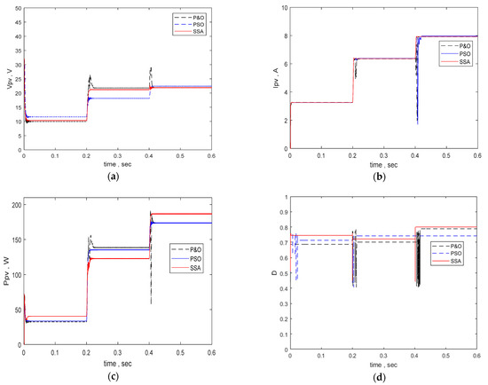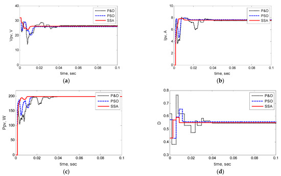 Photovoltaic panel tracking curves using P&O, PSO and SSA methods in the condition of shade pattern 1: (a) Vpv, (b) Ipv, (c) Ppv, (d) duty cycle.