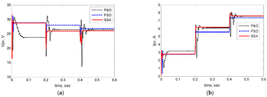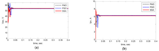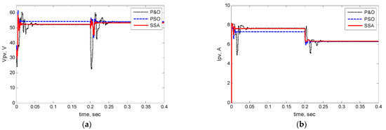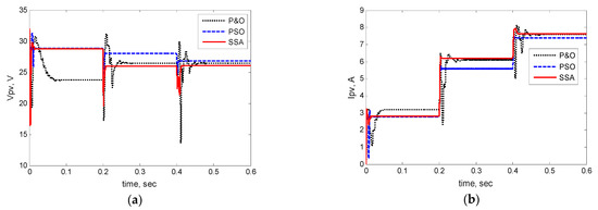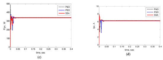 Figure 8 reveals that the performance of the SSA method compared to other methods in achieving the maximum power of the photovoltaic system was much higher in terms of convergence speed and accuracy, so few transient fluctuations were observed in the SSA method. Moreover, the results showed that the increase in radiation resulted in a decrease in the voltage and an increase in the current, increasing the PV panel’s output power. Due to this, the proposed method is more responsive to variable radiation conditions than P&O and PSO.