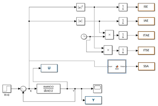 Simulink model and testing the results of ISE, IAE, ITAE, ITSE, and SSA.