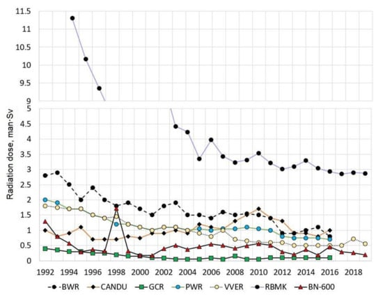 In accordance with the recommendations of the International Commission on Radiological Protection (ICRP) stated in Publication 60, (1990) the dose limit of personnel exposure was reduced from 50 to 20 mSv per year. As a result of organizational and technical measures, the annual collective doses of the personnel of foreign [] and Russian nuclear power plants (NPPs) have decreased by 3–4 times from the 1990s to the present, reaching a certain level for each type of reactor and a slight change from year to year within this level depending on the duration of repairs (Figure 1) []. Further optimization of radiation protection of personnel should be determined by measures aimed at individual dose management [], such as enhancement of the organization of works, improving the radiation situation at NPPs, and reducing the time spent by personnel in ionizing radiation fields.