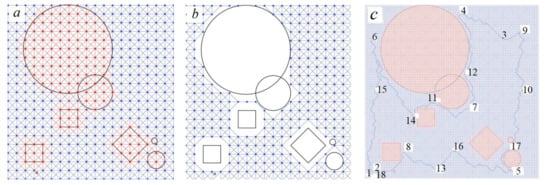 - At the first stage, we take a plan of the area with the increased level of radiation or an NPP room. We mark on it the objects that cannot be passed through, i.e., obstacles. We also highlight the points that need to be visited. Next, we build a quite fine grid on this plan, which completely covers it (Figure 2a). The nodes of this grid are discarded where it covers obstacles (Figure 2b). The grid spacing depends on the accuracy with which we want to achieve the values of the cost function. The smaller the grid spacing, the more accurate result we get, but at the same time, the counting time increases.Figure 2. Steps to find the optimal route to bypass 18 points (circles and rectangles represent obstacles): (a) plan of the NPP room with a grid and points to be visited, (b) elimination of grid nodes taking into account obstacles, (c) the best route.