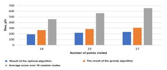 For these rooms, computational experiments were carried out to determine the optimal route of the dosimetrist with a visit to the specified points, considering the avoidance of obstacles with the preliminary construction of radiation maps based on a limited number of points with known values of the dose rate. Table 1 shows data on radiation doses when moving along the found optimal route with complete and partial information on radiation parameters at the points for room “B”, when visiting 14 specified points, considering bypassing possible obstacles [].