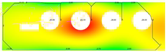 Figure 5 shows the results of the computational experiment for the real premises “A” (11.2 × 13.5 m) and “B” (11.2 × 6.7 m) of the finally stopped NPPs. For room “A”, 40 reference points with known dose rates (from 0.033 mSv/h to 6.2 mSv/h) were specified, of which five and eight points were selected to check the simulation results. For room “B”, 24 reference points (from 0.036 mSv/h to 0.62 mSv/h) were specified, from which four and five points were selected to check the simulation results.