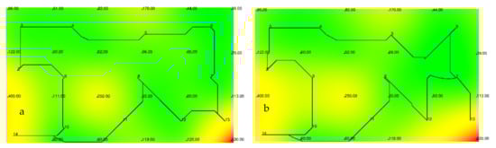 Calculations were performed using four radial basis functions. In the first case, all reference values presented in the radiation-monitoring protocols were used to build the radiation map of the room and the optimal route. In the second case, 20% of the reference values were randomly thrown out and then the radiation map of the room and the optimal route were built. Figure 6 shows the results of the graphical construction of the optimal route of the dosimetrist movement with a visit to the specified points in room B using the ThinPlate radial basis function () []. Figure 6a shows the route for the case when all reference values from the radiation monitoring data were used; Figure 6b shows the route when using 80% of the reference values at the reference points.