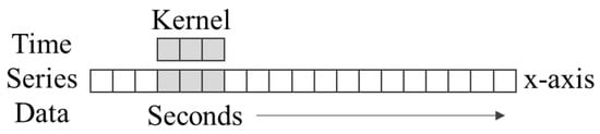 1D-CNNs are frequently used in natural language or time series processing since they can handle sequential data. Unlike in 2D-CNNs, the kernel executing convolution and the sequence of data being applied have a one-dimensional form in 1D-CNNs. As shown in Figure 2, a 1D-CNN has a kernel moving along a single dimension.