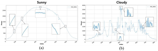 The power generation differs on a sunny and cloudy day, as shown in Figure 4a,b, respectively. The power generation on a cloudy day is low and highly inconsistent. On a sunny day, the graph has a semi-circular data distribution affected by sunrise and sunset; the power generation is the highest around noon, as indicated by the high elevation. On a cloudy day, the variability of power generation is severe due to the changes in solar radiation. Figure 4c,d shows that the power generation data on clear and cloudy days are superimposed and expressed as a scatter plot. In Figure 4c, it can be seen that the power generation production pattern on a clear day is regularly generated within a certain area. In this figure, there are cases in which the power generation data is out of range by one point. This is an outlier due to equipment error or electrical noise. In Figure 4d, it can be seen that the power generation pattern at the time of cloudy days has high variability according to the non-linear characteristics.