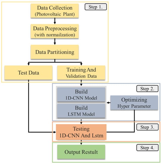 The proposed hybrid CNN- LSTM model performs PV power generation forecasting, as shown in Figure 7. In step 1, the power generation data generated from a PV power plant are classified into sunny and cloudy day data. In step 2, the collected data are pre-processed to remove noise elements, such as missing values or outliers affecting the experiment. Normalization is then applied to use the data as a network input. In step 3, the CNN and LSTM are trained using the training data. Each model only uses power generation data. In step 4, the results of the forecasting model are tested and verified using various matrices.