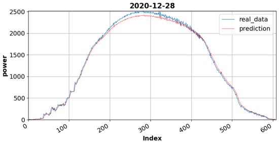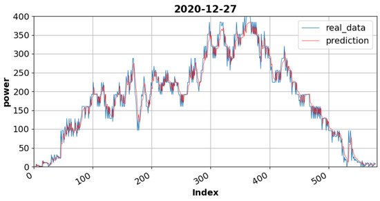 Figure 8 is the graph of the sunny day dataset; certain sections demonstrate power generation fluctuations due to clouds. Figure 9 is the graph of the cloudy day dataset in which the maximum power output is 400 W. In contrast, on a sunny day, the maximum power output is 2500 W. This result implies that the amount of solar radiation is minimal, resulting in severe fluctuations in overall power generation. The blue line shows the measured data from the device, while the red line shows the prediction data. A quantitative evaluation was performed using MAPE, RMSE, and MSE to validate the LSTM forecasting model. The LSTM model adequately followed the trend of the observation data for accurate forecasting.